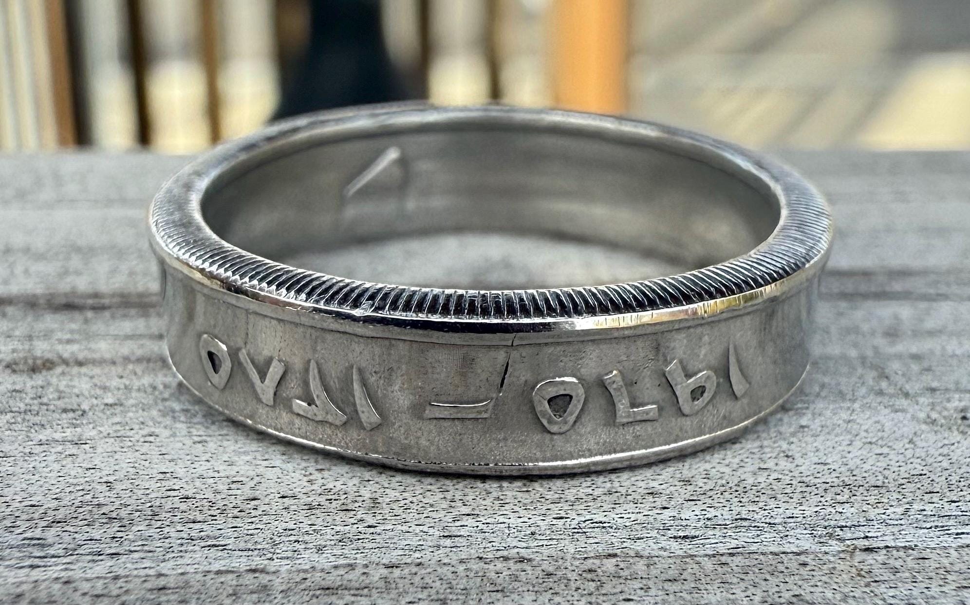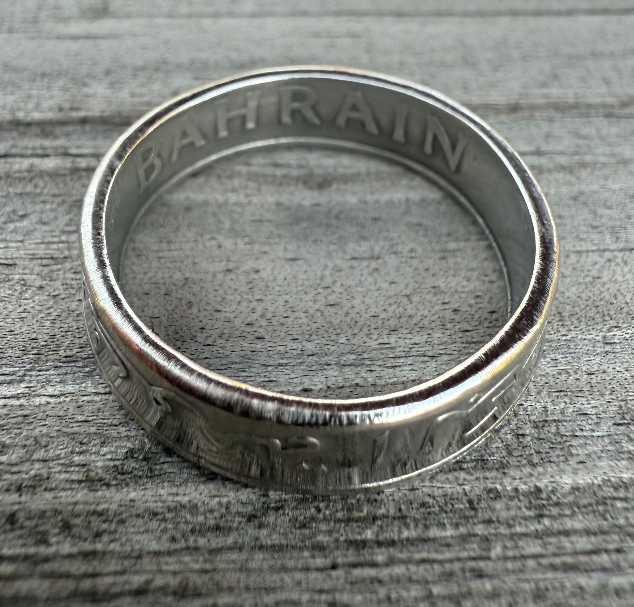 I hand make all my jewelry from coins, this piece I have handmade from an authentic Bahrain (Dates Vary/Same Design/Coin) 100 Fills Coin. This coin ring is a great statement piece to show your love and appreciation for the Kingdom of Bahrain! The effort I place in the ring is made to protect and transfer the details from the coin to the ring. Each ring is highly polished and hand crafted to ensure a parallel line amongst the ring to avoid a cone shape ring.